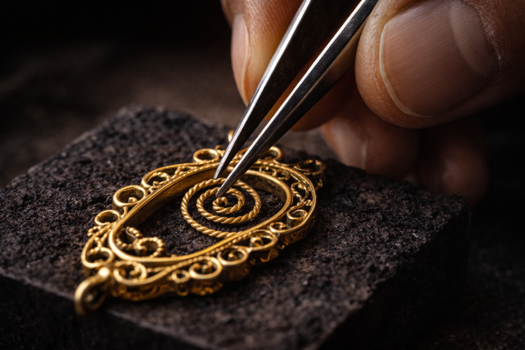 A trefilação não é apenas um trabalho de força, mas de sensibilidade táctil, onde o ourives sente a resistência do metal através da pinça trefiladora e ajusta a velocidade de tração de acordo com a resposta da liga. Fios mal trefilados resultam em uma filigrana “suja”, com falhas de brilho e pontos de soldagem frágeis que comprometem a longevidade da joia. Uma vez obtido o fio perfeito, muitas vezes torcido e laminado levemente para criar faces planas de reflexão, o artesão está pronto para iniciar a arquitetura complexa da armação e do preenchimento ornamental.