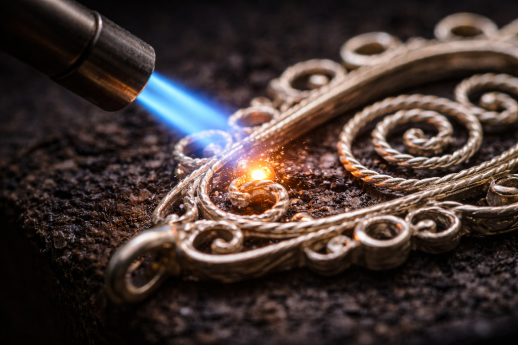 O uso de soldas com diferentes graduações térmicas — conhecidas como dura, média e fácil — permite que o ourives realize múltiplas etapas de montagem sem derreter as junções feitas anteriormente. Na filigrana, a solda é frequentemente aplicada em forma de pó ou minúsculas palhetas misturadas ao fluxo líquido, garantindo que o material de ligação alcance as fendas mais estreitas do rendilhado. O controle da chama é feito pela cor: o artesão observa o brilho do metal passar do vermelho escuro para um laranja vivo, momento exato em que o fluxo se torna vítreo e a solda corre por capilaridade.