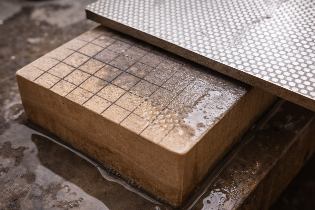 Além do nivelamento, a preparação envolve a saturação adequada da pedra. Enquanto pedras cerâmicas modernas muitas vezes exigem apenas um borrifo de água, as pedras de água tradicionais devem ser submersas até que as bolhas de ar parem de emergir, indicando que os poros estão preenchidos. Uma pedra insuficientemente hidratada absorverá a água da lama abrasiva muito rapidamente, tornando o processo seco e aumentando o atrito de forma descontrolada, o que pode causar microfissuras no aço devido ao calor localizado. A manutenção de uma superfície úmida e limpa é, portanto, o ambiente de trabalho necessário para a precisão técnica.