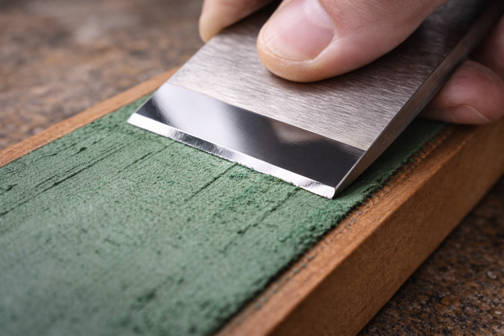 O uso do strop de couro é a etapa final e definitiva do protocolo de afilamento, funcionando como um processo de polimento ultrafino que remove os últimos vestígios microscópicos da rebarba e alinha as moléculas do gume. Um strop de qualidade, geralmente feito de couro de boi ou cavalo montado sobre uma base rígida e perfeitamente plana, é impregnado com um composto de polimento, sendo o óxido de cromo (verde) o mais comum devido à sua granulometria de aproximadamente 0,5 micron. Ao contrário das pedras, o strop é utilizado apenas com movimentos de tração (puxando a lâmina para longe do gume), para evitar que a borda afiada penetre no couro e estrague tanto o suporte quanto o próprio fio.