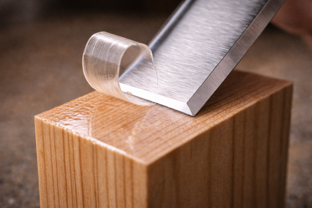 Outro aspecto vital é a diferenciação entre os lados do couro. Muitos strops possuem um lado “carne” (mais áspero) para segurar melhor o composto de polimento e um lado “flor” (liso) para a finalização absoluta. Começar pelo lado com composto e terminar no couro limpo ajuda a garantir que nenhuma partícula do composto permaneça no gume, o que poderia, teoricamente, atuar como um contaminante microscópico ao entrar em contato com madeiras extremamente delicadas ou acabamentos químicos. O resultado final deste processo é um gume que não oferece resistência ao ar e que corta fibras de madeira como se fossem manteiga, produzindo o característico som de “chiado” que indica uma afiação perfeita.
