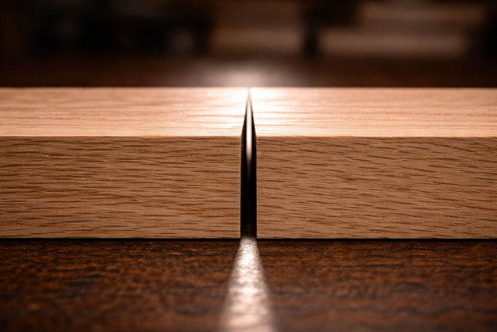 Durante a montagem a seco, a junta de mola deve ser testada quanto à sua estabilidade lateral. Ao pressionar as duas pranchas uma contra a outra sem grampos, elas devem apresentar uma leve resistência ao deslizamento no centro, enquanto as pontas permanecem firmemente unidas. Se a junta “balançar” sobre o ponto central, significa que a superfície ficou convexa, o que é um erro crítico que resultará em uma falha de colagem. A desempenadeira é a única ferramenta manual capaz de produzir este nível de controle geométrico com fluidez, permitindo que o marceneiro sintonize a união de grandes painéis com uma precisão que beira a perfeição mecânica.