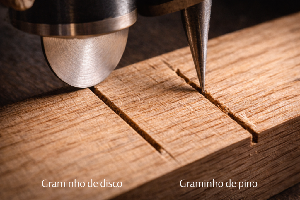 A interação entre a lâmina e a capilaridade da madeira também deve ser considerada pelo marceneiro experiente. Uma linha cortada profundamente com um graminho de disco sela as células da madeira ao longo da incisão, o que pode ajudar a prevenir o espalhamento de colas e acabamentos em áreas onde a precisão visual é crítica. Ao escolher entre o disco e o pino, deve-se avaliar a dureza da espécie lenhosa e a complexidade do encaixe que será executado; para encaixes finos como caudas de andorinha, a precisão cirúrgica do disco é geralmente a escolha preferencial para evitar o esmagamento das fibras na zona de união.
