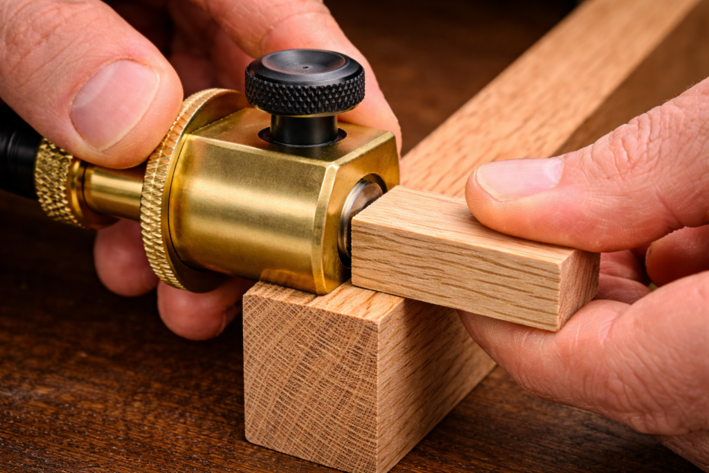 A maior virtude do medidor de marcação é a sua capacidade de realizar medições comparativas em vez de medições absolutas. Em vez de medir a espessura de uma peça com uma trena e tentar replicar essa medida no graminho, o marceneiro deve utilizar a própria peça como referência de ajuste. Ao colocar a madeira entre o cabeçote e a lâmina e travar o fuso, elimina-se completamente o erro de leitura associado às escalas graduadas. Esta técnica de transferência direta garante que as juntas sejam dimensionadas de acordo com a realidade física dos materiais em uso, e não de acordo com medidas nominais que podem variar devido a lixamentos ou aplainamentos.