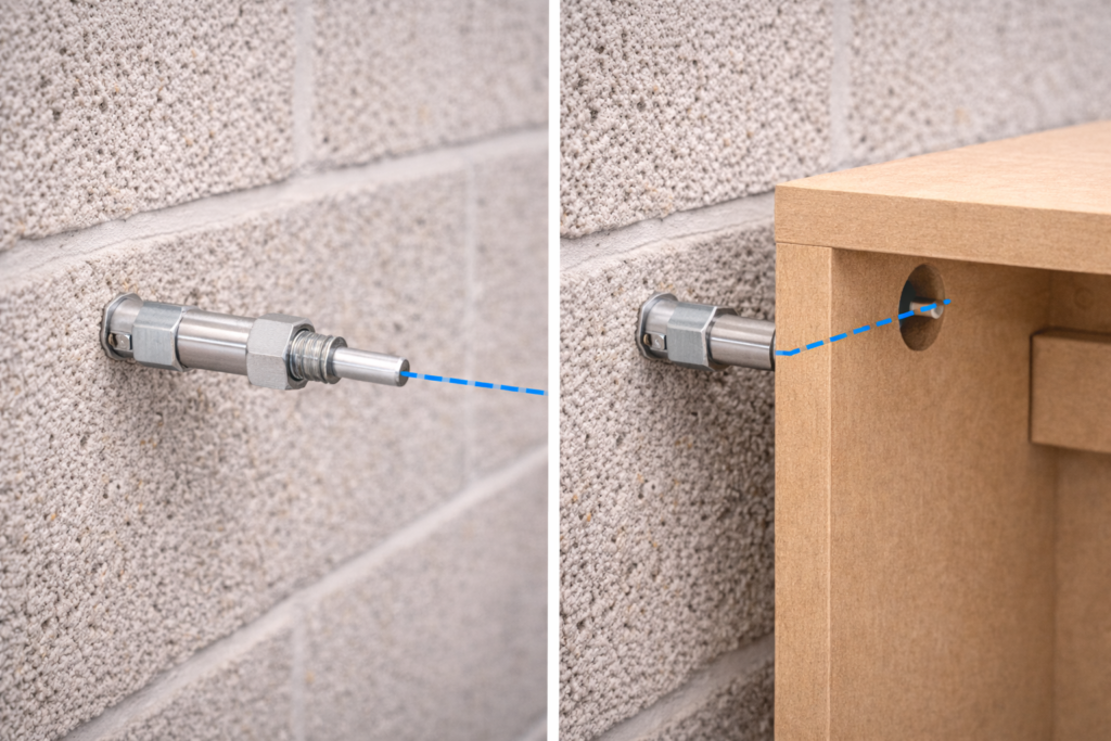 A furação no móvel precisa ser perfeitamente alinhada com a furação da parede. Gabaritos, níveis a laser ou moldes de papel evitam erros cumulativos. Na parede, buchas químicas são a escolha profissional para alvenaria; em drywall, a fixação deve coincidir obrigatoriamente com os montantes estruturais.