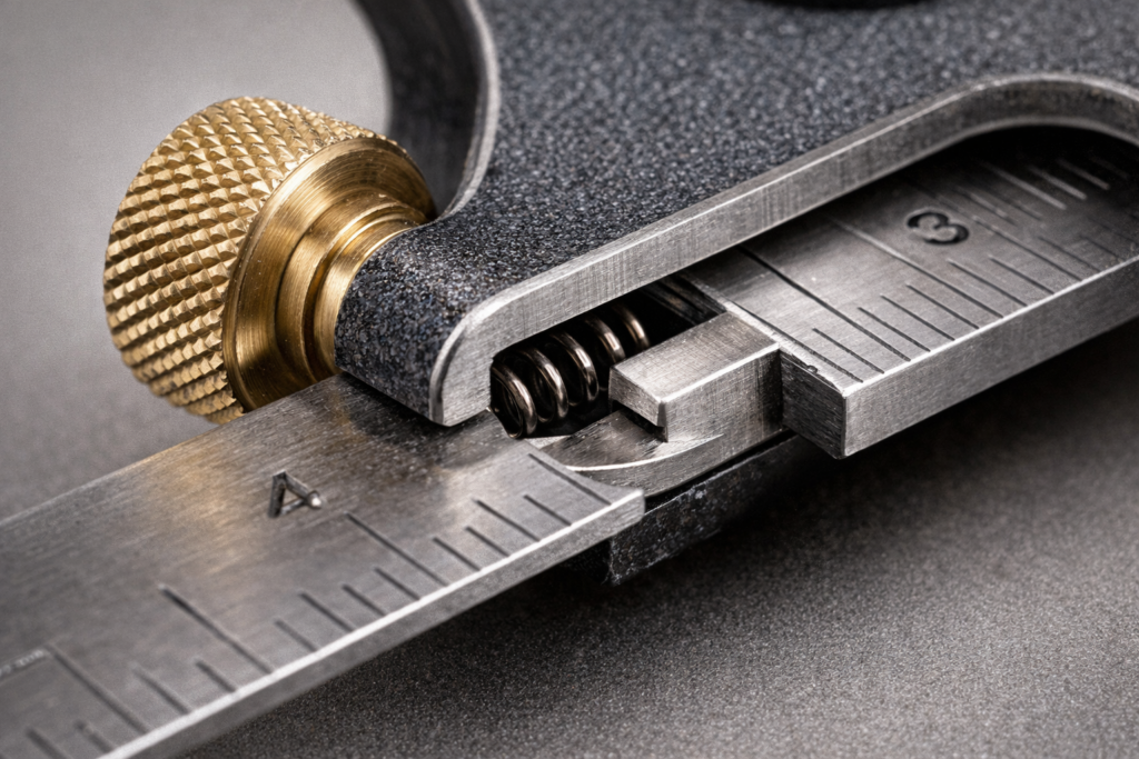 O coração do esquadro combinado reside no mecanismo de travamento do cabeçote, composto por um ferrolho com ranhura, uma mola de compressão e um parafuso serrilhado. Essa engenharia permite que a régua deslize suavemente e seja fixada com firmeza em qualquer posição, mantendo a perpendicularidade absoluta. A qualidade desse mecanismo define a repetibilidade do instrumento; se o ferrolho apresentar folgas ou se a mola perder a tensão, a régua poderá oscilar lateralmente, introduzindo erros de leitura. Um cabeçote de alta categoria é usinado com tolerâncias mínimas, garantindo que a régua assente perfeitamente em sua calha de guia, eliminando qualquer jogo mecânico que possa comprometer a aferição.