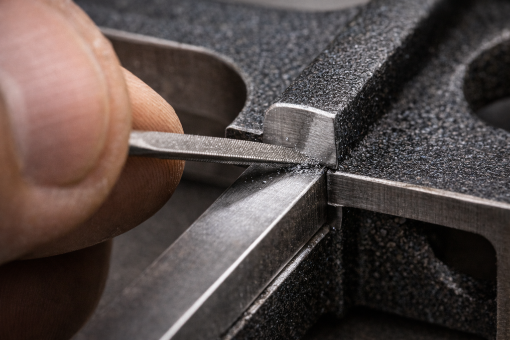 Quando o teste da linha invertida revela um erro de ortogonalidade, o artesão tem duas opções: descartar o instrumento ou proceder à sua retificação manual. Em esquadros combinados de qualidade, é perfeitamente possível corrigir o ângulo do cabeçote através de uma limagem de precisão nas superfícies de apoio internas (onde a régua assenta). Este é um trabalho de extrema delicadeza, onde cada passagem da lima remove centésimos de milímetro de metal. O objetivo é alterar a inclinação da régua em relação à face de referência do cabeçote até que o erro seja zerado no teste da linha invertida.