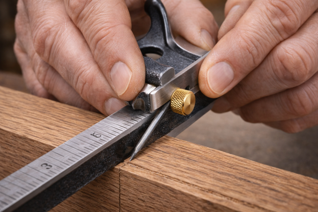 Uma das maiores vantagens do esquadro combinado é a sua capacidade de atuar como um graminho de precisão para marcações múltiplas e paralelas. Ao travar a régua em uma dimensão específica, o artesão pode transferir essa mesma medida para diversas peças sem a necessidade de ler a escala repetidamente. Isso elimina o erro humano de leitura e garante que todos os componentes de um projeto (como as quatro pernas de uma mesa) possuam as mesmas referências de altura e posição para os encaixes. A marcação múltipla é a chave para a produtividade com precisão na oficina artesanal.