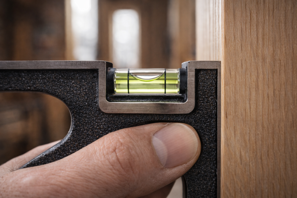 O nível de bolha integrado, embora pequeno, é uma ferramenta poderosa para a instalação de móveis e a verificação de superfícies de bancada. Para que seja confiável, o nível deve ser testado através da inversão: coloca-se o cabeçote sobre uma superfície e observa-se a bolha; ao girar a ferramenta 180 graus no mesmo local, a bolha deve indicar exatamente a mesma posição. Se houver discrepância, o nível não deve ser usado para medições críticas. Em oficinas onde o piso ou as bancadas podem não estar perfeitamente nivelados, o esquadro combinado serve como um referencial rápido para garantir que as estruturas verticais de um armário estejam em prumo.