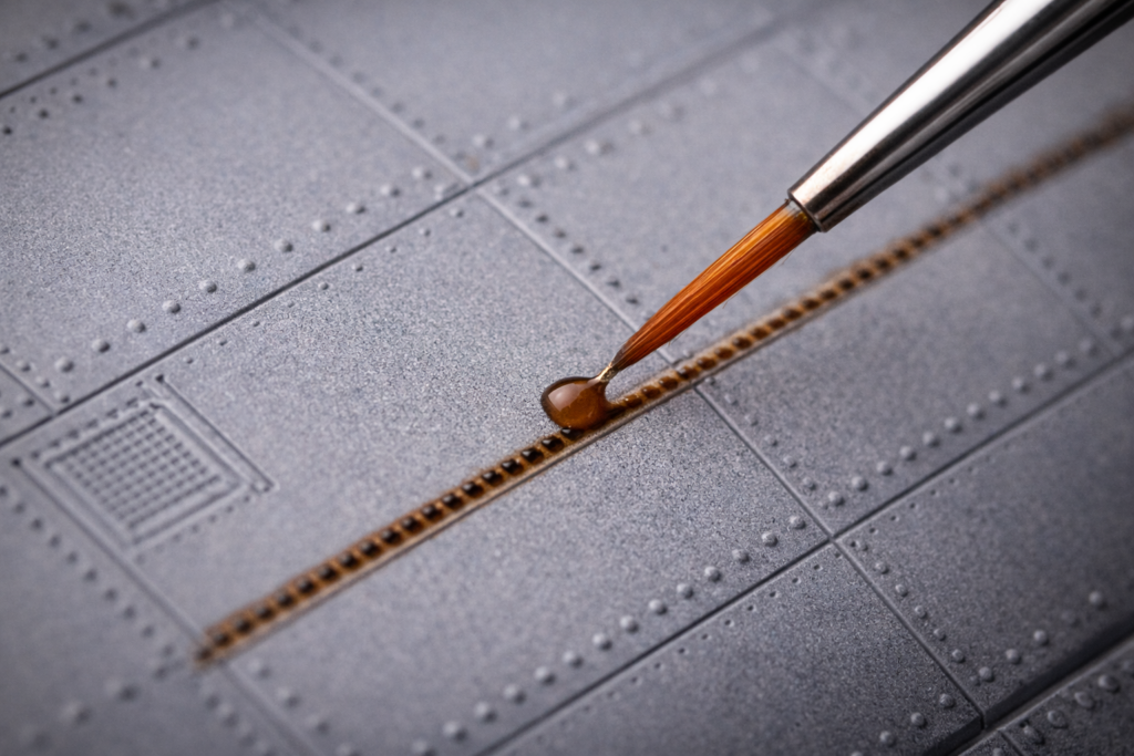 O envelhecimento, ou intemperismo técnico, é o processo de transformar um objeto novo em um item que possui história. A técnica da lavagem por capilaridade utiliza tintas a óleo ou esmaltes altamente diluídos que, ao serem depositados em recessos e linhas de painel, fluem instantaneamente devido à baixa tensão superficial. Isso define os detalhes e cria sombras artificiais onde o acúmulo de sujidade e resíduos ocorreria naturalmente. É a aplicação prática da física de fluidos para realçar a geometria complexa do modelo.