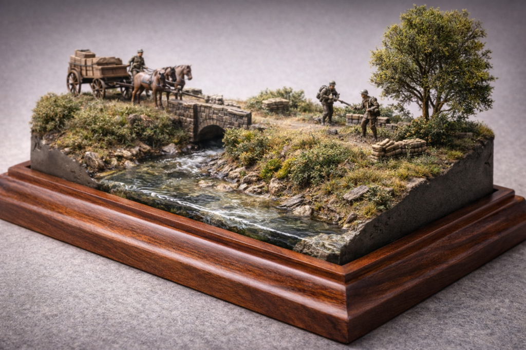 O detalhamento do ambiente deve ser tão rigoroso quanto o do modelo principal. Um muro de tijolos deve apresentar variações de cor entre os blocos e argamassa visível nos sulcos profundos. A vegetação deve mostrar sinais de estação do ano e interação com o objeto principal, como grama esmagada por rodas ou esteiras. O cenário bem sucedido cria uma moldura de realidade que engana o cérebro do observador, fazendo-o esquecer que observa um objeto que cabe na palma da mão, transformando a cena em um documento histórico ou fantástico congelado no tempo e na forma.