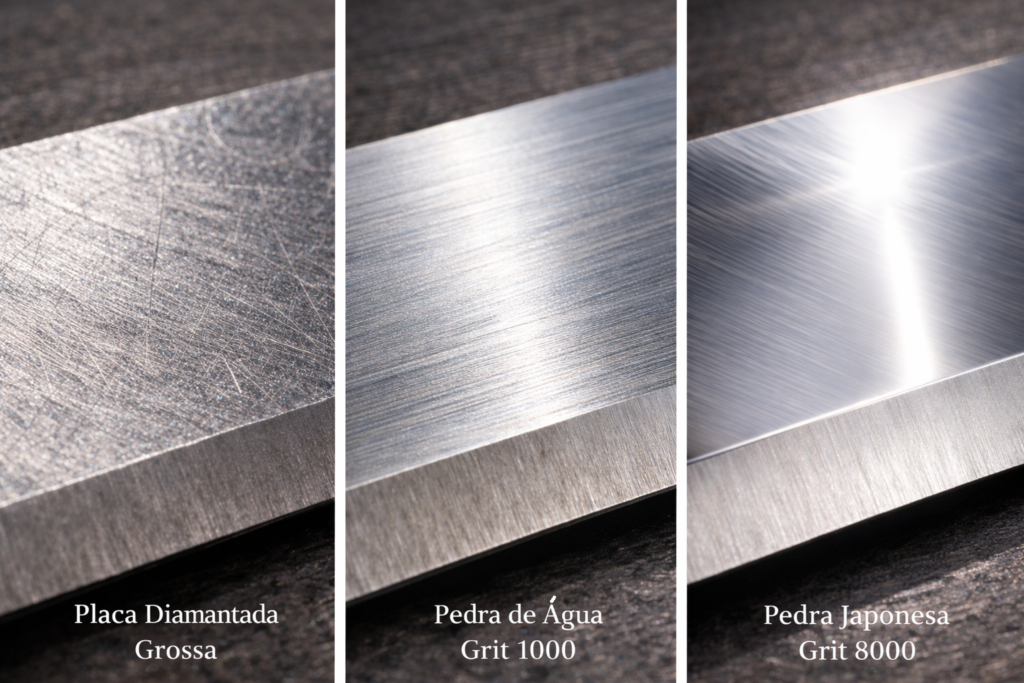 A escolha dos meios abrasivos determina a velocidade, a precisão e o custo do processo de afiação em uma oficina de alta performance. As placas de diamante tornaram-se populares devido à sua planicidade inalterável e à capacidade de cortar rapidamente os aços mais duros e as ligas modernas, sendo ideais para o desbaste inicial e para o nivelamento das pedras de água. No entanto, para o polimento final e a obtenção de um gume verdadeiramente cirúrgico, nada supera a lama abrasiva produzida pelas pedras japonesas de água. Estas pedras funcionam através de um mecanismo de desgaste controlado, onde os cristais abrasivos se quebram e revelam novas arestas cortantes, proporcionando um acabamento que as placas de diamante não conseguem replicar nas granulações mais finas.
