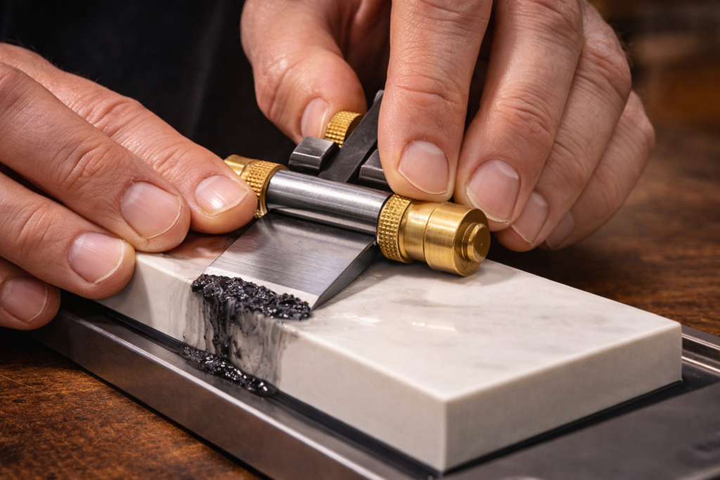 No estágio final, a rebarba deve ser removida de forma absoluta através de passagens leves e alternadas entre as costas e o chanfro na pedra de polimento mais fina disponível. Este processo, conhecido como desrebarbamento, é o que revela a verdadeira agudeza da ferramenta. Se a rebarba for apenas dobrada de um lado para o outro sem ser efetivamente removida, ela se soltará durante o primeiro corte na madeira, deixando para trás um gume frágil e que perderá a afiação instantaneamente. A remoção microscópica completa da rebarba é o selo de uma afiação técnica de alta categoria, garantindo que o aço atinja seu potencial máximo de corte e que o gume permaneça íntegro por muito mais tempo durante o uso intensivo na bancada.
