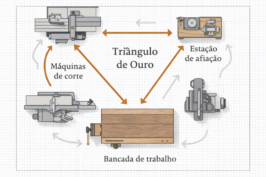 A ergonomia de uma oficina de marcenaria moderna baseia-se na minimização do deslocamento desnecessário e na otimização do fluxo de materiais entre as diferentes estações de trabalho. O conceito do Triângulo de Ouro da marcenaria — que interliga a bancada principal, as máquinas de dimensionamento e a estação de afiação — deve ser o norteador do layout espacial para garantir que as tarefas mais frequentes ocorram em uma zona de movimento compacta e lógica. Ao reduzir a distância que o marceneiro percorre com pranchas pesadas ou instrumentos delicados, diminui-se a fadiga física e aumenta-se o foco nas operações de corte, permitindo uma produtividade sustentável ao longo de jornadas intensas de trabalho na bancada.