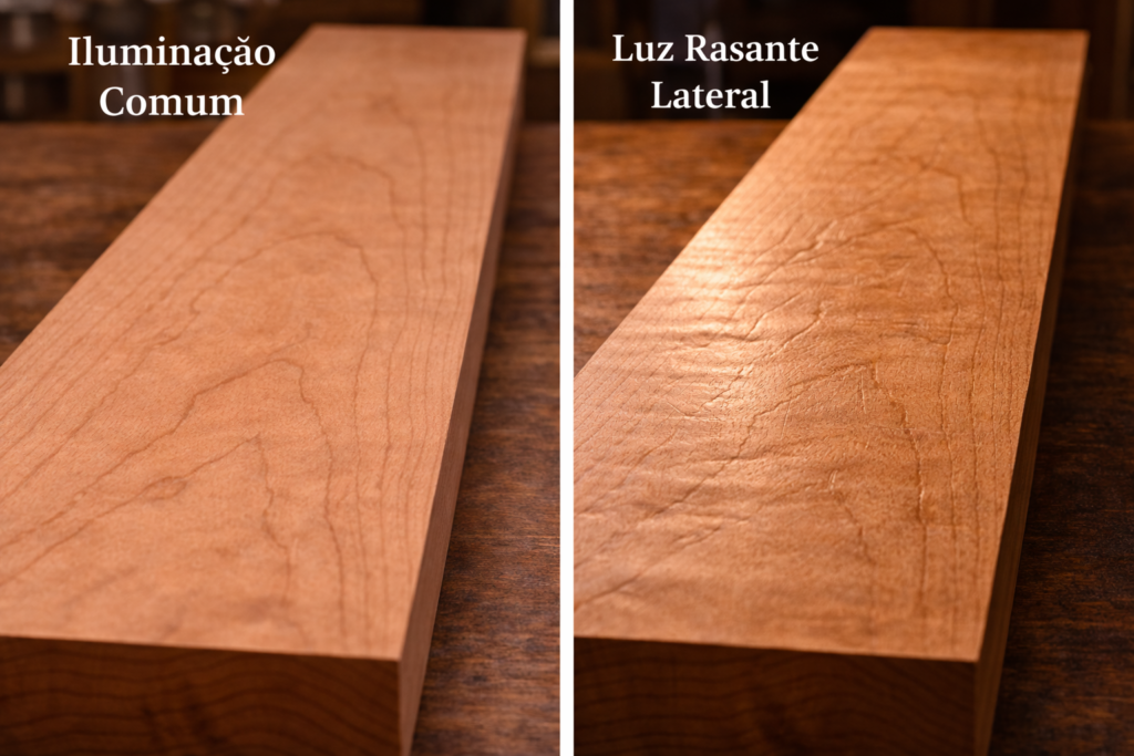 A luz rasante, posicionada em ângulos baixos em relação à bancada, é a ferramenta visual definitiva para identificar ondulações superficiais, marcas de plaina e resíduos de cola que seriam invisíveis sob iluminação zenital. Essa técnica de iluminação técnica transforma a superfície da madeira em uma paisagem de luz e sombra, facilitando o controle de qualidade durante o aplainamento e o lixamento manual. A psicologia do espaço de trabalho também é beneficiada por um ambiente bem iluminado, que promove a vigilância e o cuidado, desencorajando o desleixo e a pressa que são as causas principais de erros técnicos e acidentes operacionais na marcenaria artesanal.