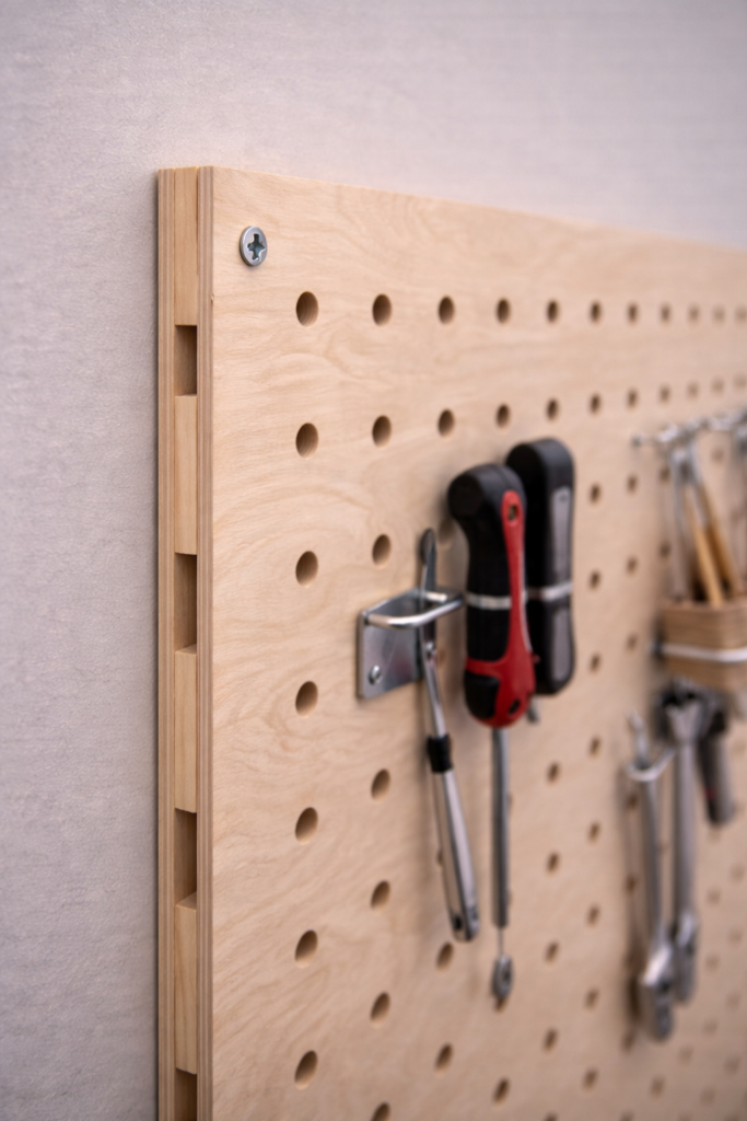 A madeira compensada é, de longe, a opção mais equilibrada para esse tipo de projeto. Diferentemente do MDF, suas lâminas cruzadas distribuem melhor as tensões criadas pelos ganchos e evitam rupturas ao redor dos furos. O MDF pode até funcionar em painéis decorativos ou para ferramentas extremamente leves, mas falha rapidamente quando submetido a alavancagem repetitiva.