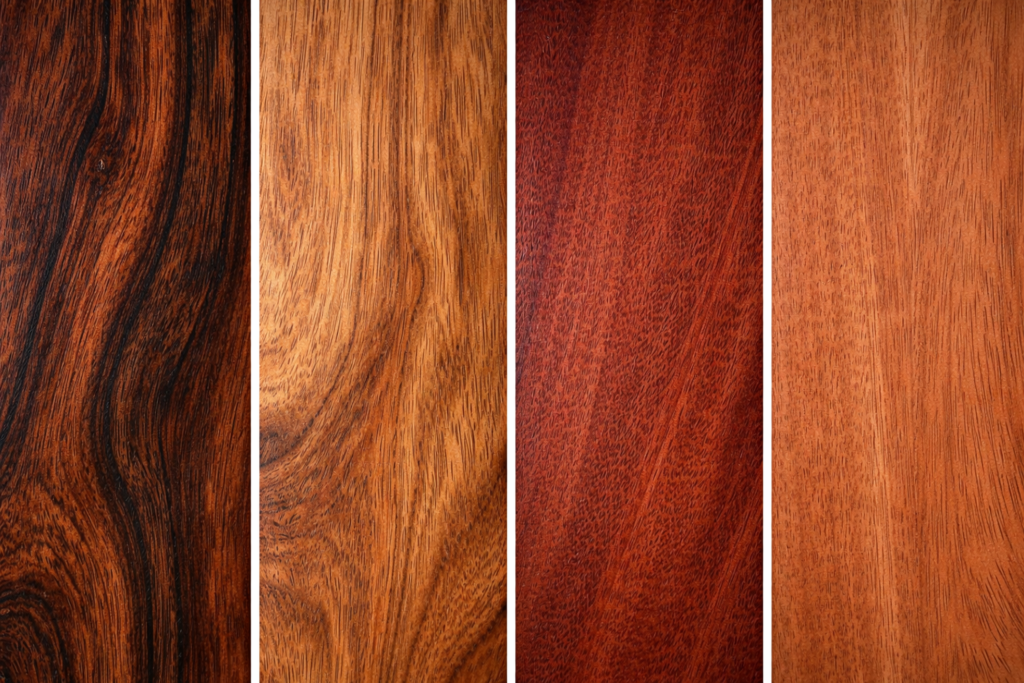 - Jacarandá-da-Bahia: veios escuros e contrastantes, aroma adocicado ao corte, alta densidade.