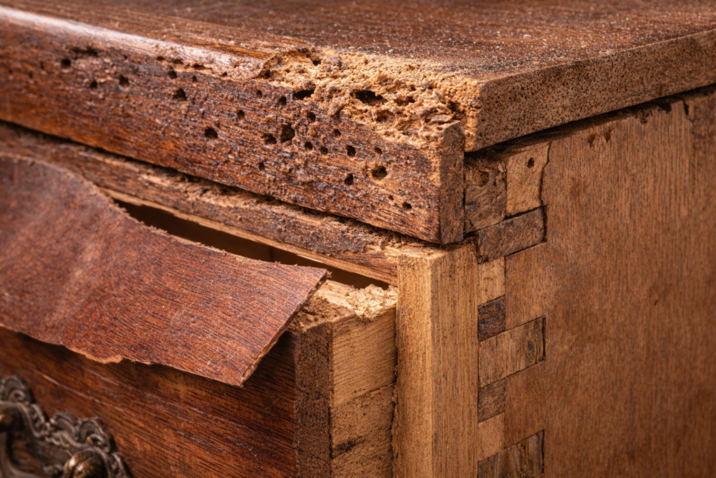 O diagnóstico deve ser feito com calma, luz adequada e inspeção manual. Cupins e brocas, por exemplo, deixam vestígios claros, mas nem todo furo indica infestação ativa. Da mesma forma, folheados antigos podem apresentar pequenas movimentações sem que isso comprometa a peça. Alguns critérios ajudam a separar problema de pátina: