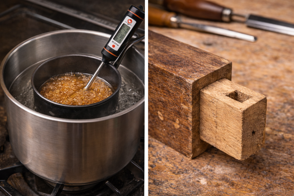 A cola é o coração invisível da marcenaria tradicional. Antes da popularização das colas sintéticas, móveis de alta qualidade eram montados com colas de origem animal, extraídas de ossos ou peles, ricas em colágeno e perfeitamente compatíveis com a madeira antiga.