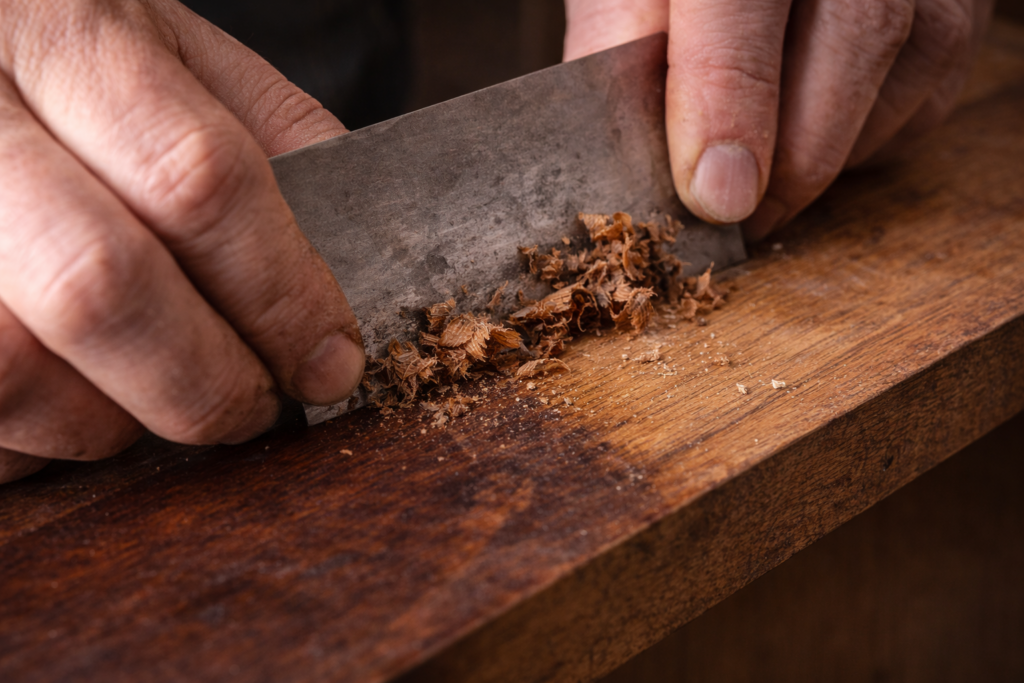 Quando a remoção completa se torna necessária, a técnica correta não é a lixa, mas a rasquetilha. Essa lâmina afiada “barbeia” a superfície, preservando os poros abertos da madeira, algo essencial para acabamentos tradicionais como a goma laca.