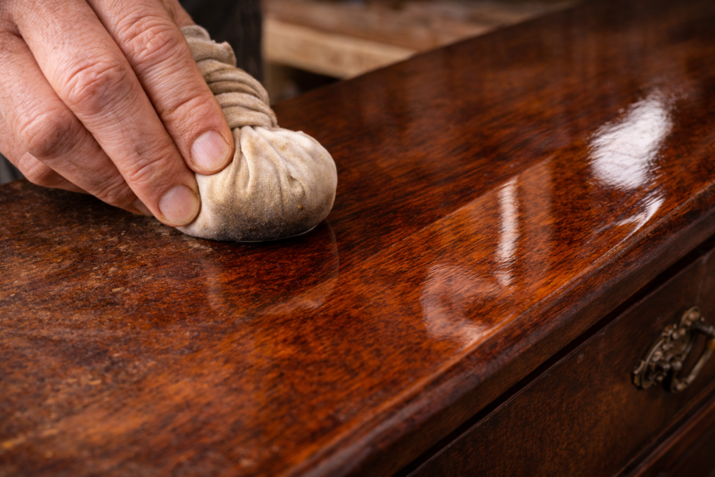 A aplicação é feita com a “boneca”, um chumaço envolto em tecido fino, e exige paciência quase meditativa. O calor gerado pelo atrito funde as camadas sucessivas, formando uma película contínua, viva e reparável.