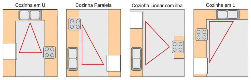 O conceito mais clássico é o chamado triângulo de trabalho, que conecta geladeira, pia e fogão. Essa relação não é estética, mas funcional: são os três pontos mais acessados durante o preparo das refeições. Quando mal posicionados, criam cruzamentos, congestionamentos e deslocamentos desnecessários que tornam a rotina cansativa e improdutiva.