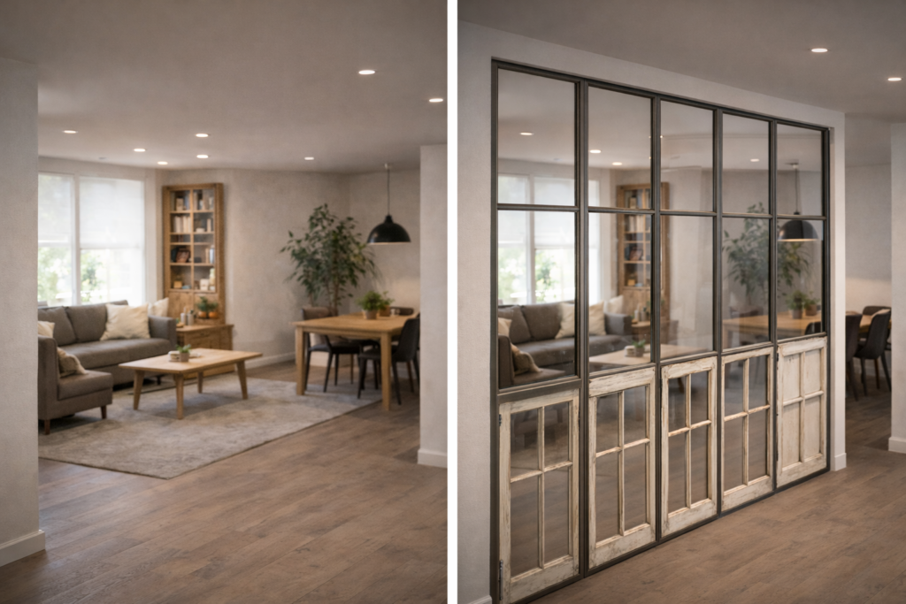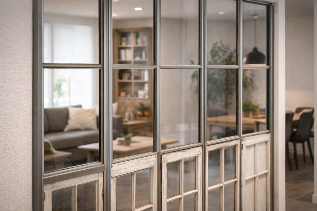 Divisórias de vidro reaproveitado exigem um nível muito maior de planejamento. Diferente de quadros e molduras, aqui o vidro passa a atuar como elemento espacial, separando ambientes e interagindo diretamente com circulação e uso cotidiano.